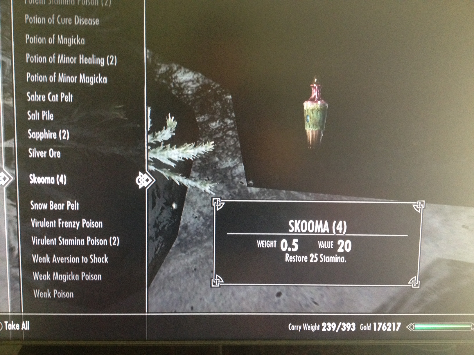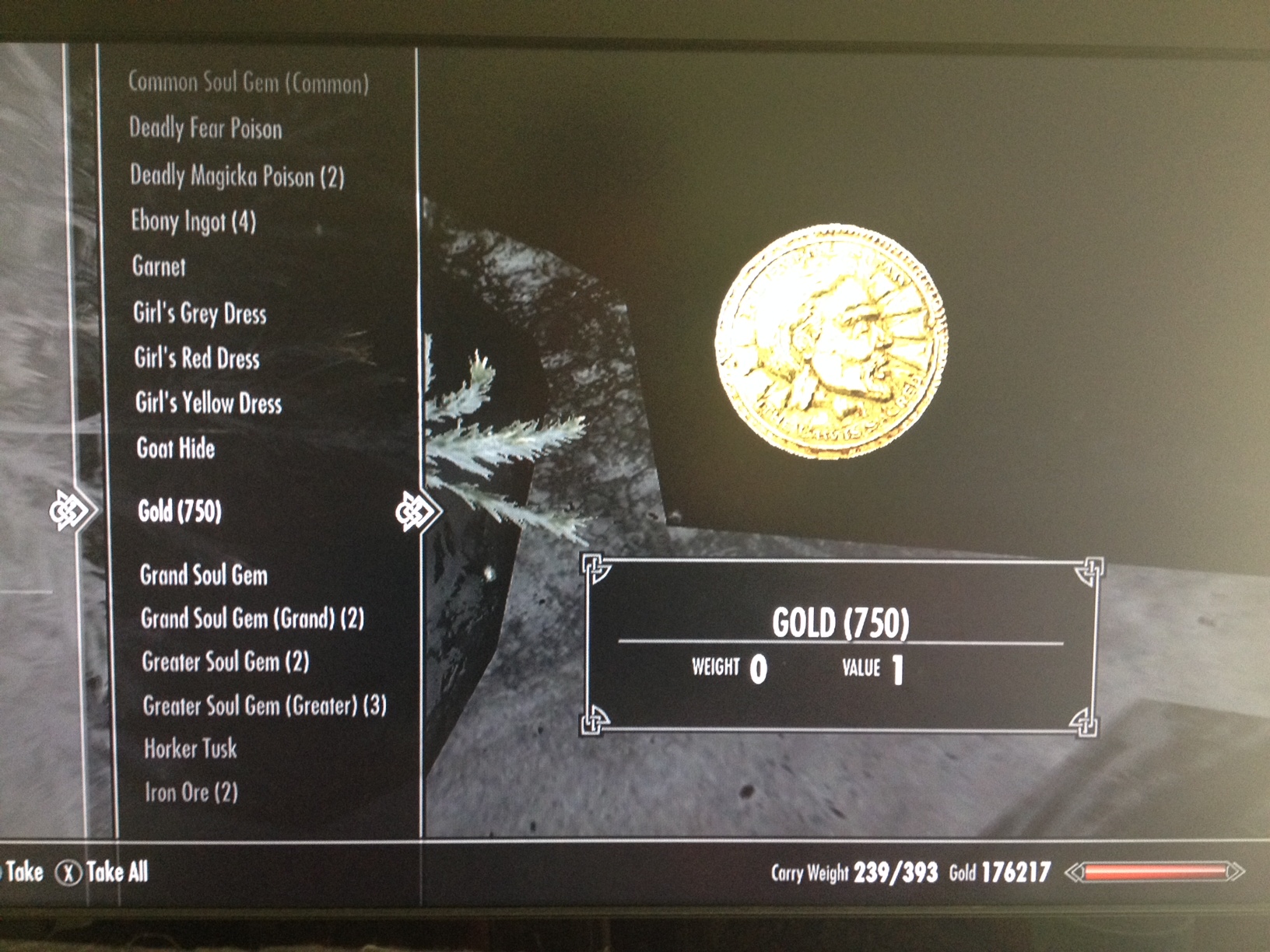 (Put another way: I had just cleared out my inventory prior to going to Dawnstar; I hit [X] Take All, and was immediately overburdened again. Good times.]