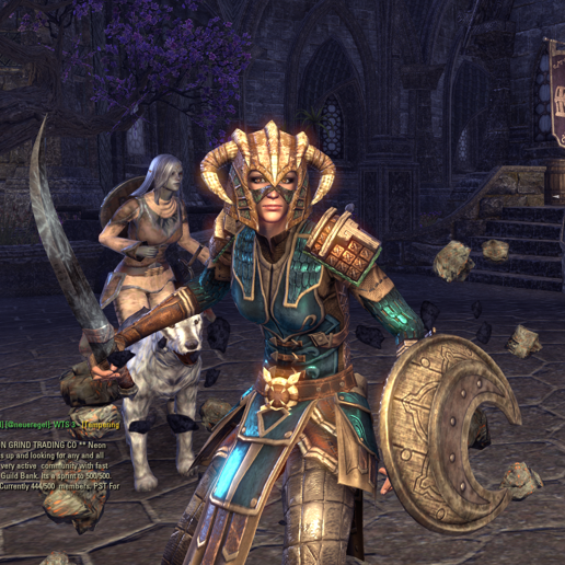 Not too shabby! I love how the crazy width of the Nord horns match the crazy width of the Ancient Elf shoulders (normally I think that particular Nord helm in ESO is waaaaay too outbalanced and makes most toons look like Viking bobbleheads. But here I liked it!) Also, hard to see I know but she has some heavy gauntlets too and I like the way the hands look more here.