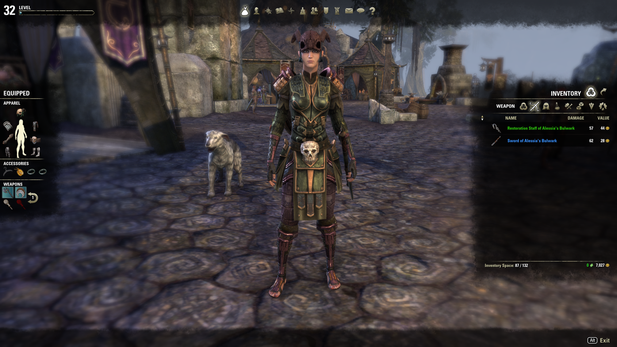 Final mix: a heavy armor Argonian “crown” (in honor of finishing Shadowfen!) over Altmer chest, legs, and feet. Ancient Elf shoulders and medium bracers for the hands, and I kept with the Barbaric light armor sash for the waist. I’ve always loved the Bosmer staves and think they only get better with higher levels so I crafted one of those for my secondary set, then a one-handed axe in the Nord style, in honor of my arrival in Eastmarch, first of two Skyrim zones (well, three actually if you count the starter isle of Bleakrock.)