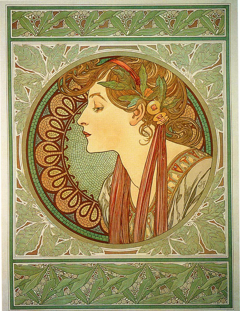 I was thinking of the color palettes of some Art Nouveau artists, especially Alfonse Mucha, and the way they used greens with orange, copper, gold and reds in such an interesting way. Additionally, it was autumn here in New England, where the half-turned trees create real-life Art Nouveau fantasias every day—well, for a few weeks, until the winds descend, rip the leaves off the trees, and plunge us into winter 😀