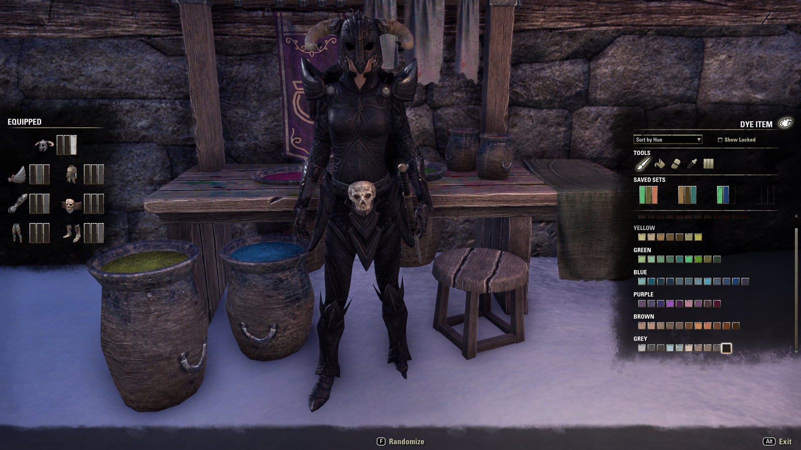 I did at one point try a little something out, had a piece from a dropped set or maybe it was a quest reward, in the Nord style (horns! 🙂 ) and I decided to put it on, dye it black, and see what I thought: