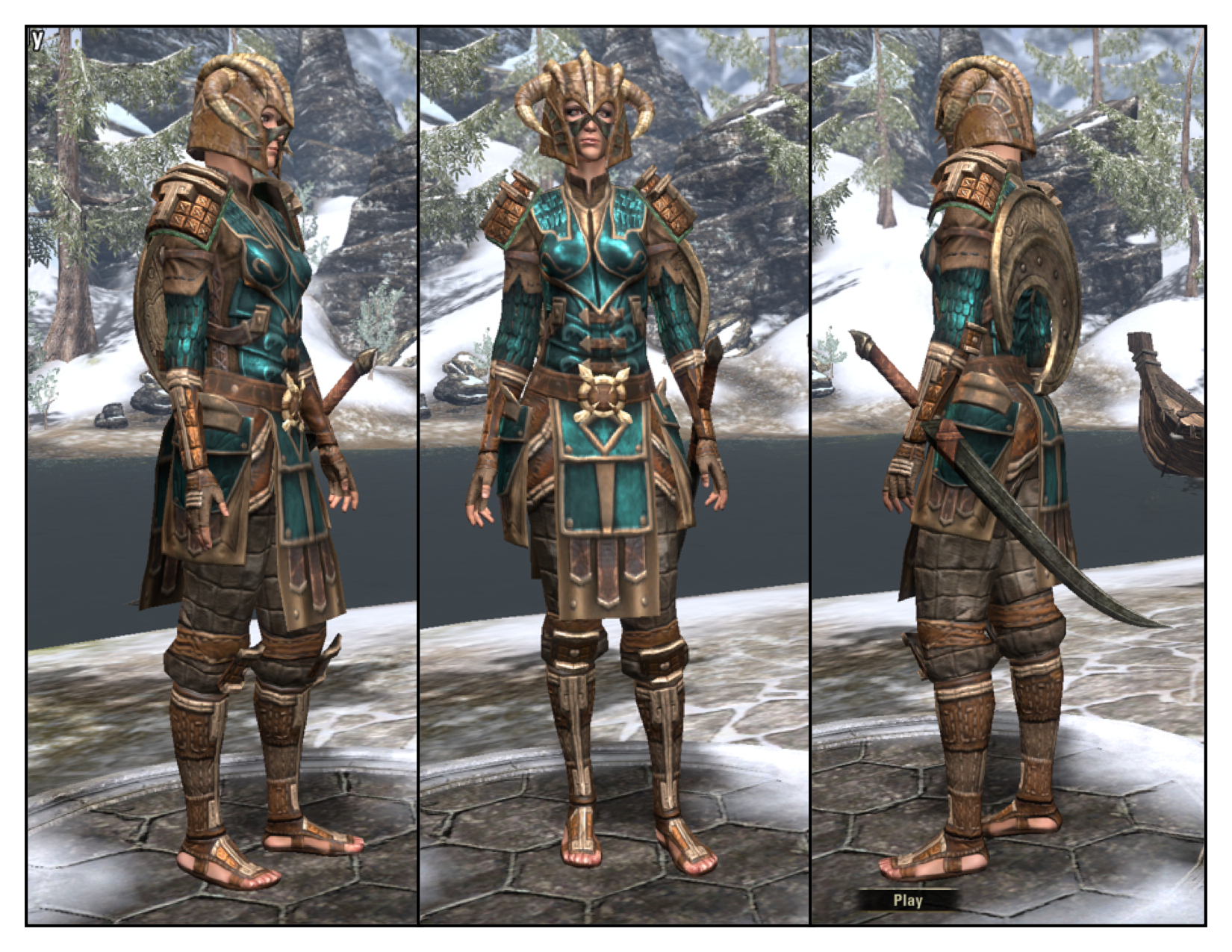 At the dye station I ended up with a gold-and-brown base (Craftmaster-, Hlaalu-, and Hunding Golds), punctuated by metallic turquoise and teal (Doomcrag Verdigris for the torso, Jute- and Vine Greens for some accents on helm and pauldrons). I was lucky that the Khajiit shield was perfectly in the palette since we still can’t dye those—soon, though, I hope!