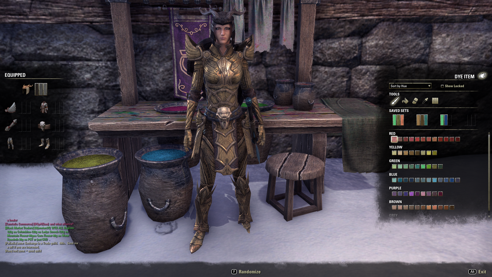 That’s a light Bosmer hat (antlers! yay!) and medium Primal belt. The rest is heavy armor: Ancient Elf for the pauldrons, cuirass, and gauntlets, and Altmer legs and feet. Admittedly, it all makes a nice gold ensemble, but the antlers made me think of the lost colony of Roanoke Island and the legend of Virginia Dare and the White Doe.
