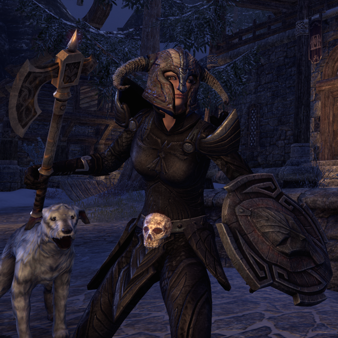 I was pretty happy with how it came together, especially since I needed to make my Dwemer shield (in dark grey with purplish overtones) still work with it all. This is Thessaly at level 42, the above-mentioned armor and shield supplemented with an Ancient Elf one-handed axe, and an Altmer restoration staff (not shown.)