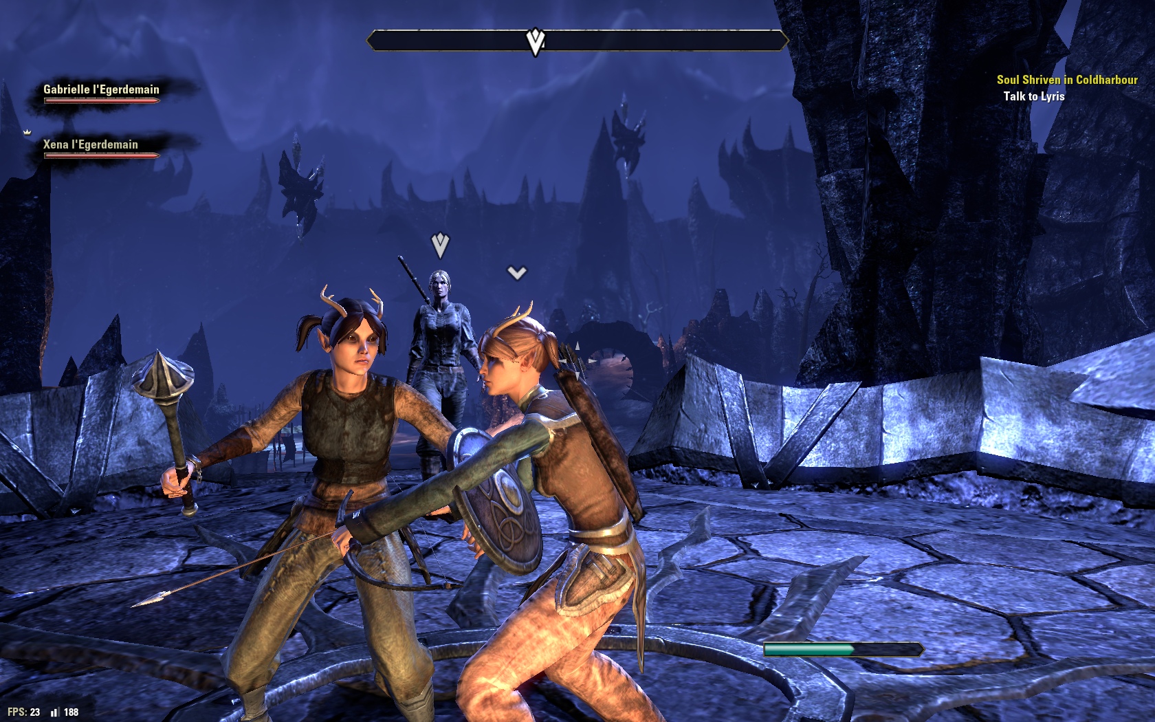 That’s my sister Gabrielle. I’m the dark one, she’s the fair one. But I’m taller. Not that that means much, being Bosmer—”wood elves” in the tongues of Man—as a people we’re not exactly known for our verticality. But that doesn’t mean we won’t slit you from gut to gorge if you provoke us.