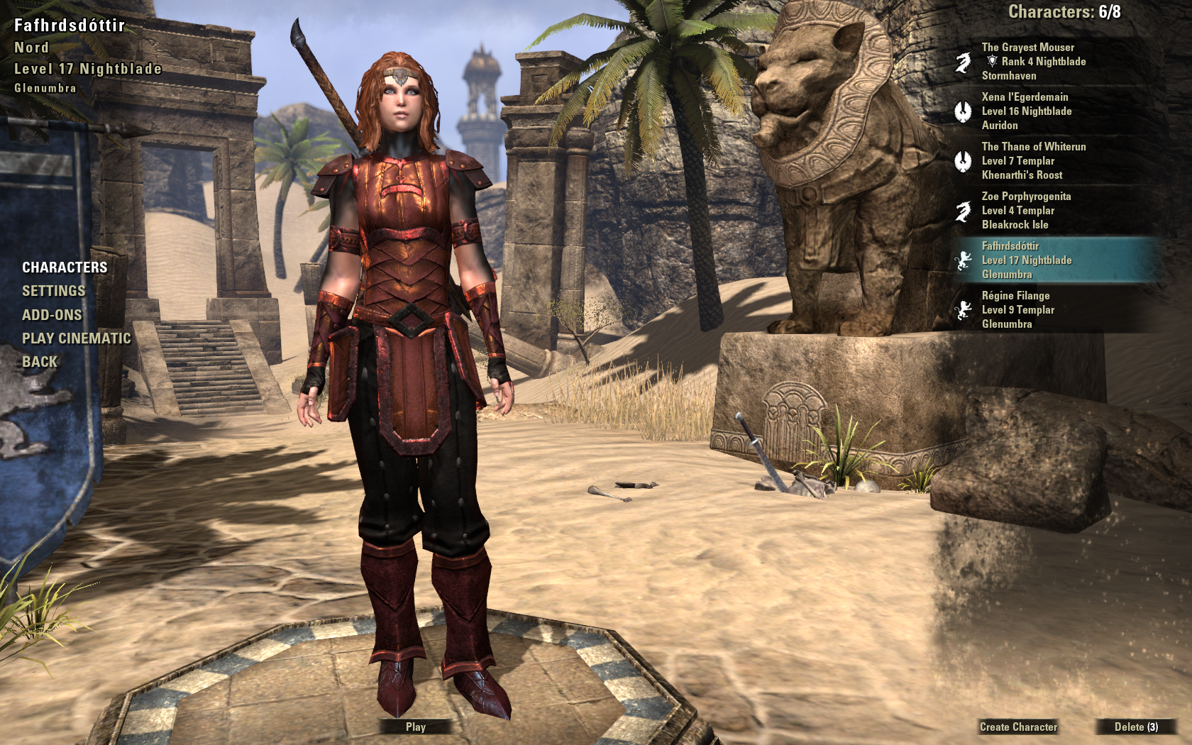 Xena is just getting to a level where she can start using some of the dropped sets I’ve been hoarding for her since god knows when. First up: Akaviri Dragonguard set, you can see her sporting the chest piece for that here, will get the rest when she hits level 18. Thunderous Plate set after that, around level 20-23.