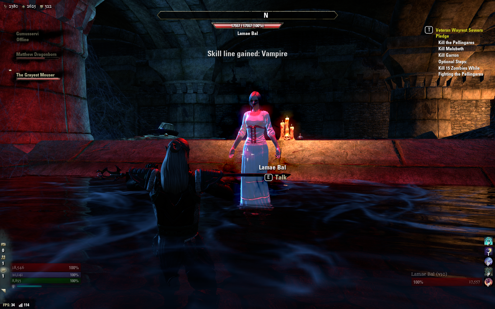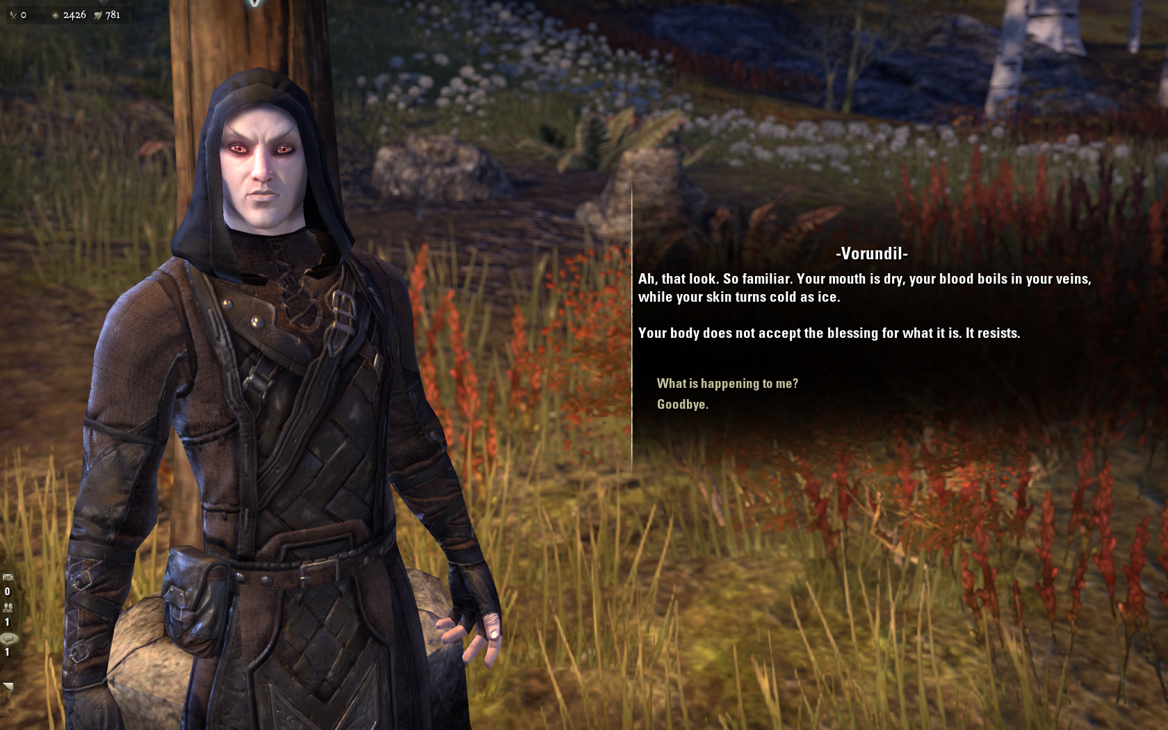 Since Mouser acquired sanies lupinus the all-natural way, it only seemed proper to do the same when I decided to take him down the blood-sucking path instead. So he got cured of his lycanthropy just in time for the new moon* and went roaming the dark dark countryside of The Rift. With a bit of luck (and some helpful players in zone chat) we found a horde of wild Bloodfiends, got bitten, and headed back into town to let the undeath begin!